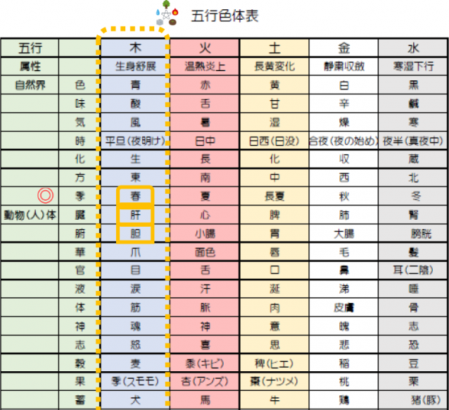 また最近のように、雨が降ったり止んだりすると、私達は湿気の影響を受けて食欲が落ちたり、お腹を壊しやすくなります。(図の五行色体表の土(ど)の列を下へたどって行くと、土は湿気の性質を持っていて、土の臓と腑は「脾」と「胃」なので、そういう症状を起こすのですね。)