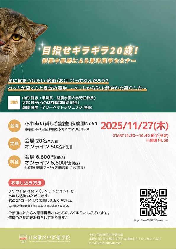 『《目指せキラキラ20歳!獣医中医師による東洋医学セミナー》のご案内』