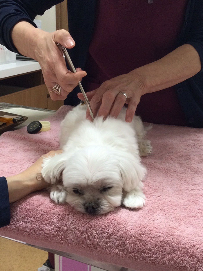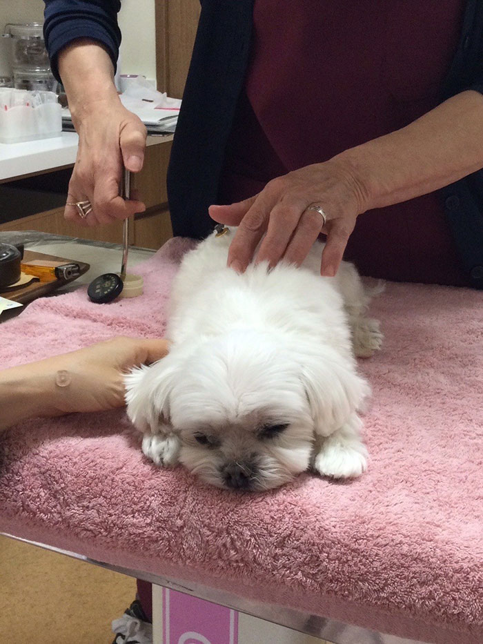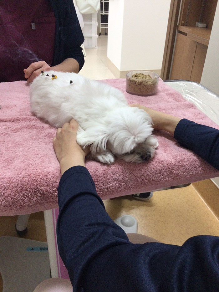 「気管虚脱」「ヘルニア」「結石」「加齢による後肢の弱り」などの症状があり、院長に鍼灸をしてもらっています。
