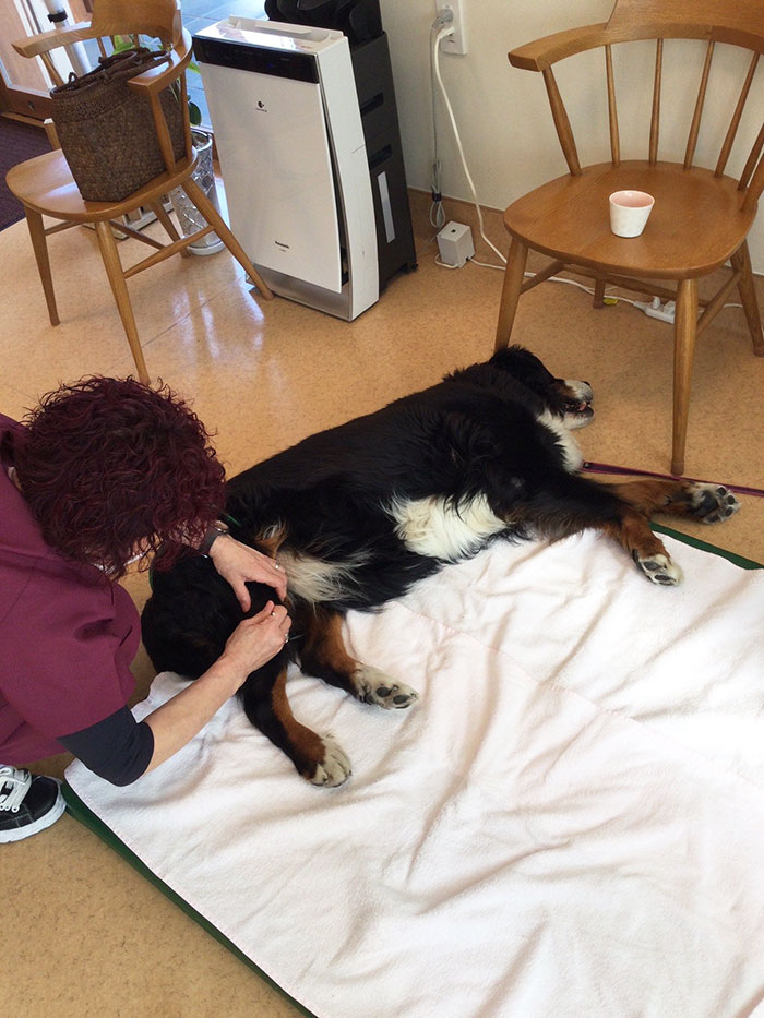通院当初は治療中あちらへこちらへと移動することもあったはなちゃんでしたが、鍼灸にだいぶ慣れたようで、この日は治療中リラックスしてくれていました。